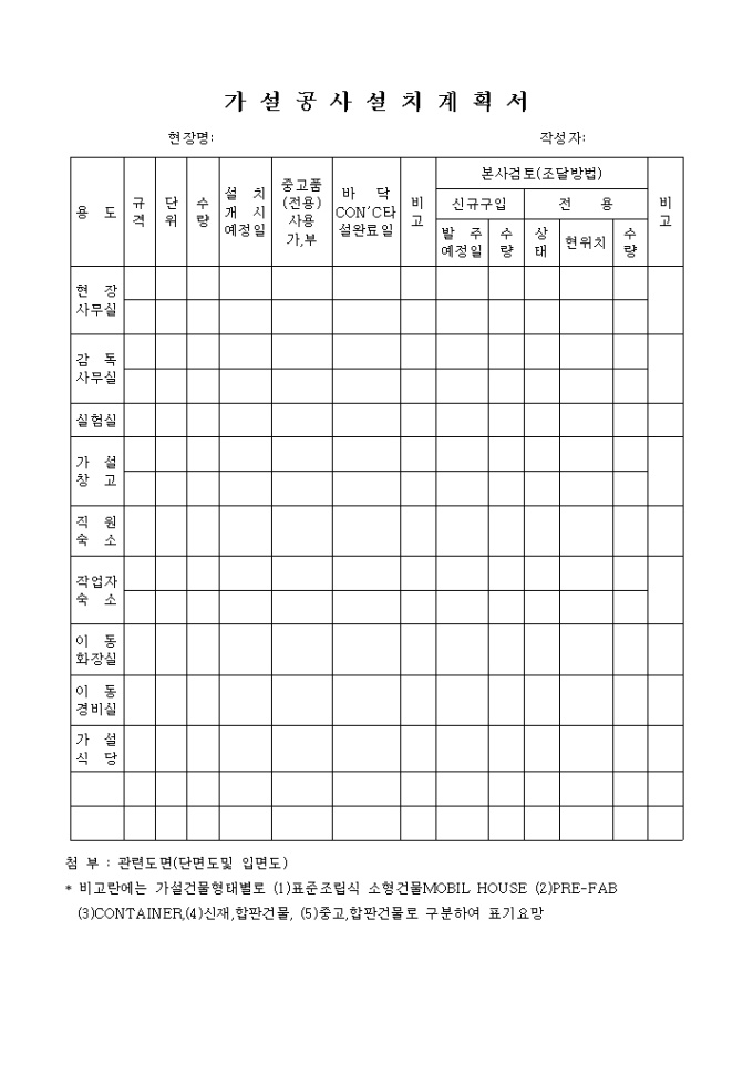 용도별 규격,단위,수량,설치개시예정일,중고품 사용 가/부,바닥CON´C타설완료일,본사검토로 구성되어 있는 양식입니다.