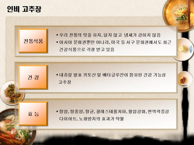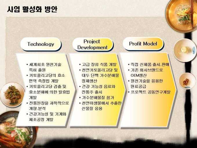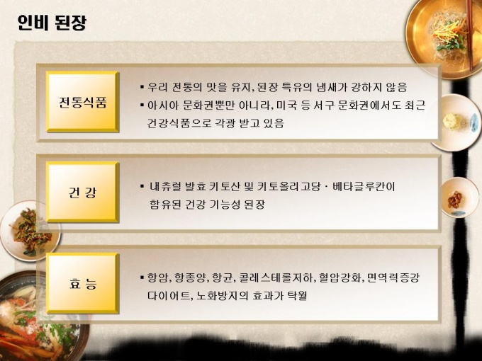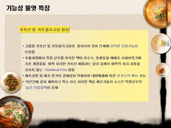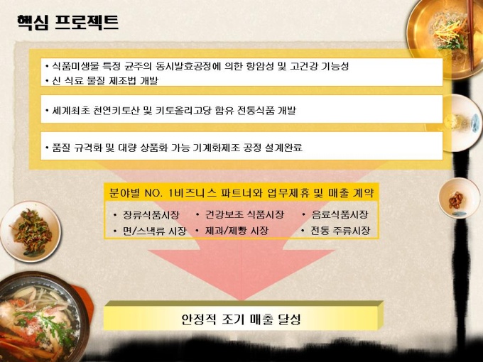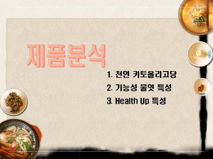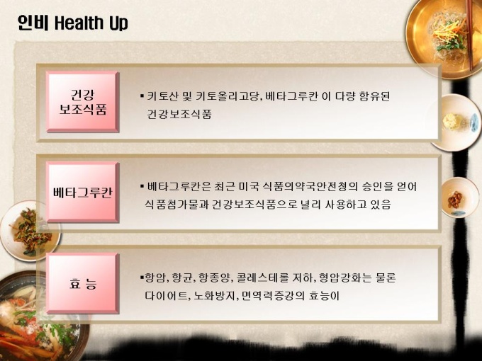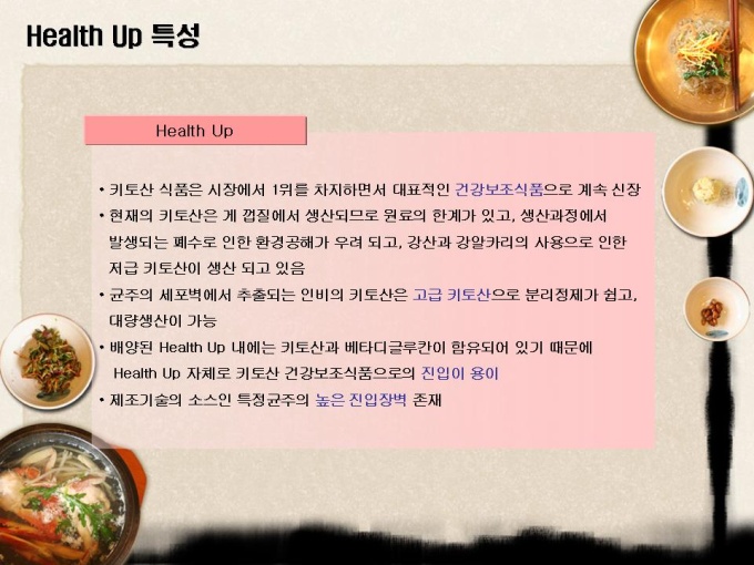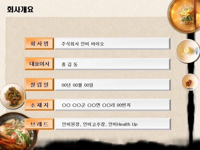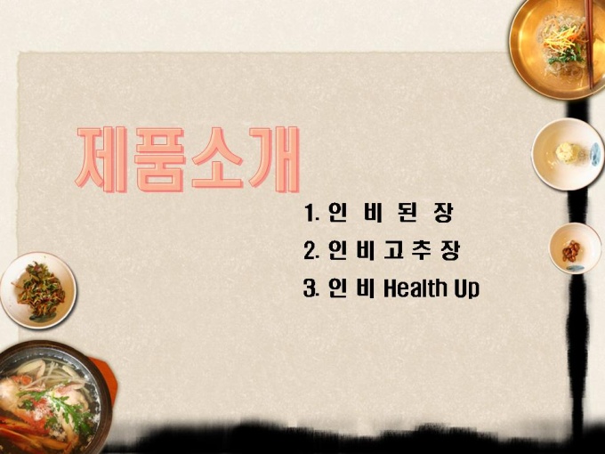 <목차> 1.자사현황 1-1. 회 사 개 요 1-2. 경영진 현황 1-3. 연구인력 현황 1-4. 핵심 기술 현황 2. 제품소개 1-1. 인 비 된 장 1-2. 인 비 고 추 장 1-3. 인 비 Health Up 3.제품분석 3-1. 천연 키토올리고당 3-2. 기능성 물엿 특성 3-3 Health Up 특성 4. 사업추진개요 4-1. 사업 활성화 방안 4-2. 핵심 프로젝트 4-3. 중장기 프로젝트