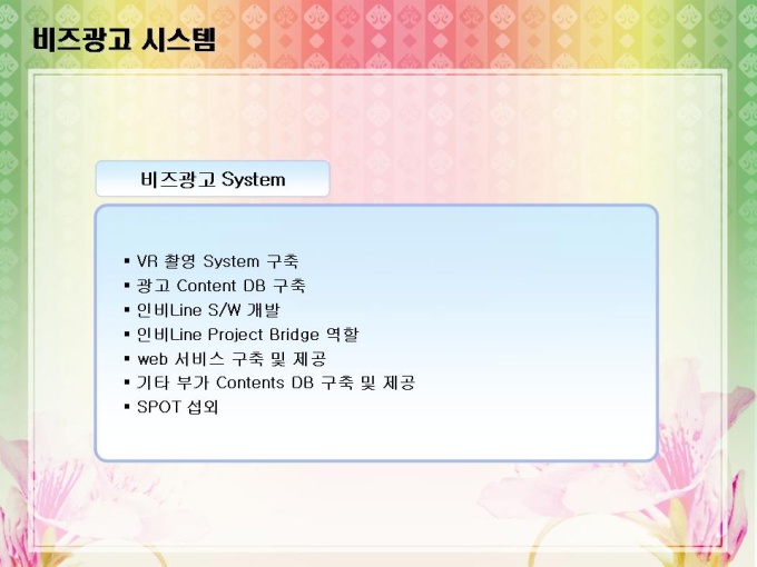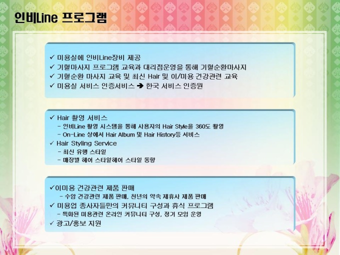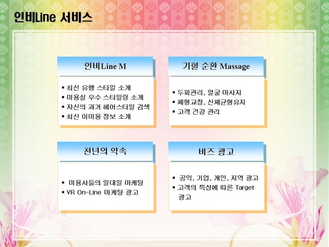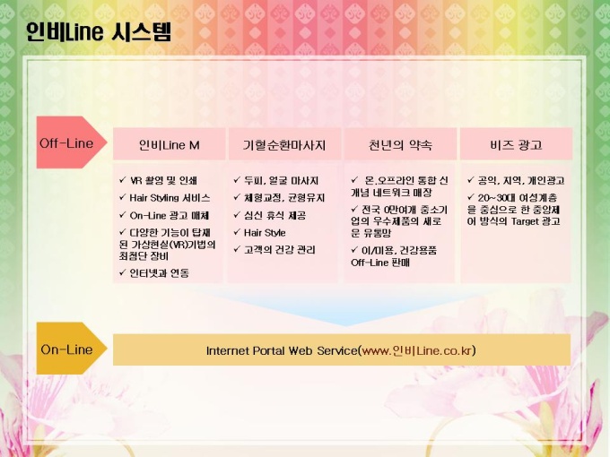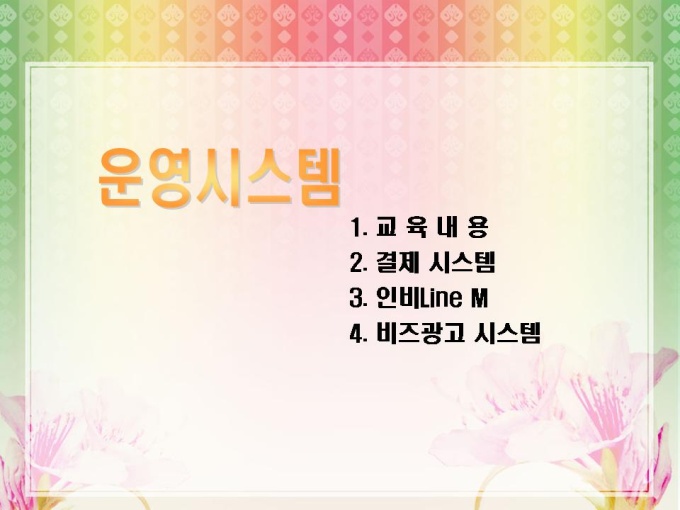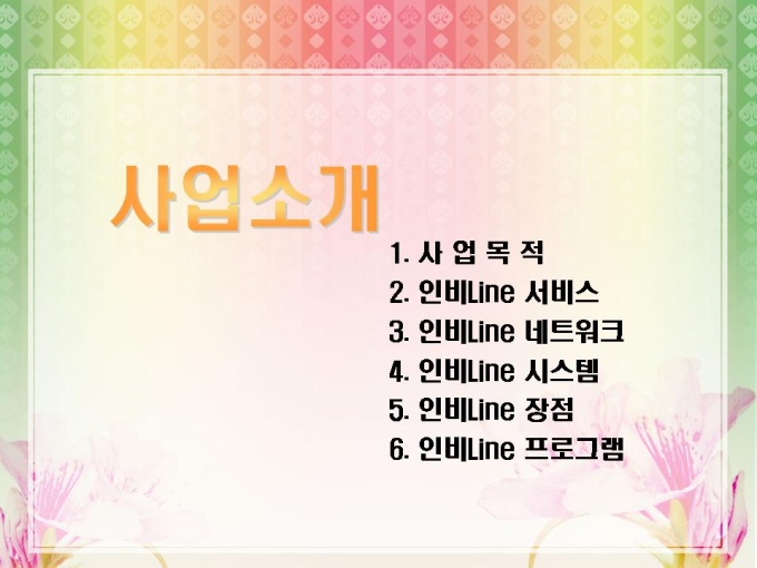 <목차> 1. 사업소개 1-1 사 업 목 적 1-2 인비Line 서비스 1-3 인비Line 네트워크 1-4 인비Line 시스템 1-5 인비Line 장점 1-6 인비Line 프로그램 2. 운영시스템 2-1 교 육 내 용 2-2 결제 시스템 2-3 인비Line M 2-4 비즈광고 시스템 3. 사업전망 3-1 SWOT 분석 3-2 다른매체와 비교분석 3-3 기 대 효 과 3-4 추 진 일 정