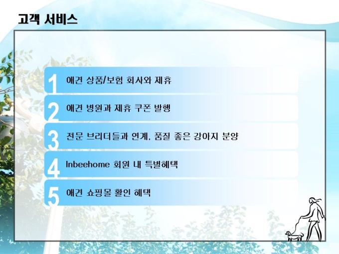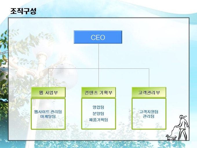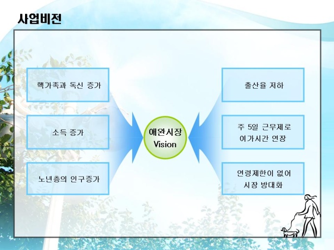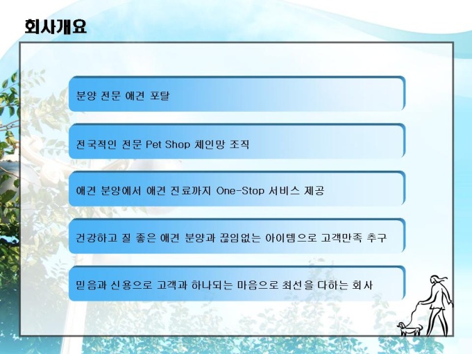 <목차> 1. 회사소개 1-1 회 사 개 요 1-2 조 직 구 성 1-3 사업 네트워크 2. 시장현황 2-1 애견시장현황 2-2 사 업 비 전 2-3 시 장 규 모 2-4 애견 수요층 3. 사업분야 3-1 쇼핑몰 아이템 3-2 쇼핑몰 서비스 3-3 운 영 방 식