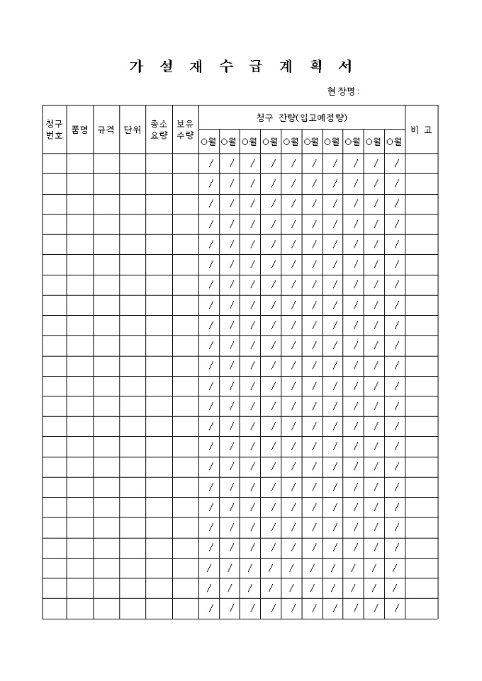 청구번호,품명,규격,단위,총소요량,보유수량,청구잔량을 기록하는 가설재수급계획서입니다.