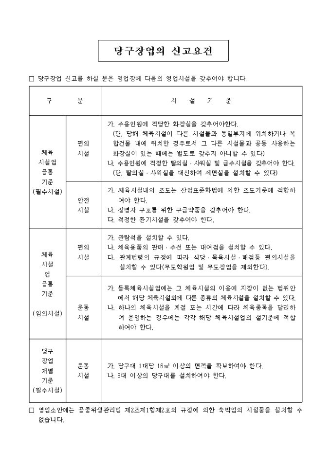 당구장업을 신고할 경우 영업장에 갖추어야 할 영업시설에 관한 사항을 정리해 놓은 당구장업의 신고요건입니다.
