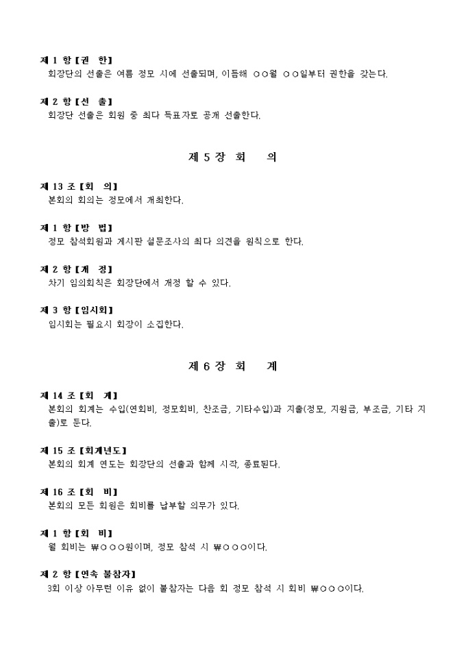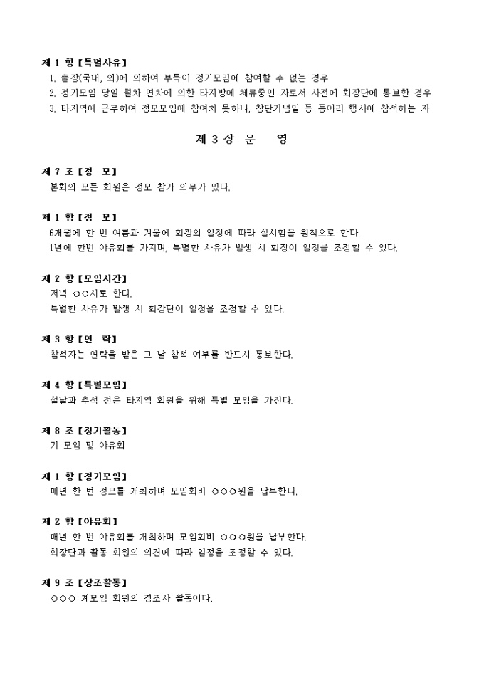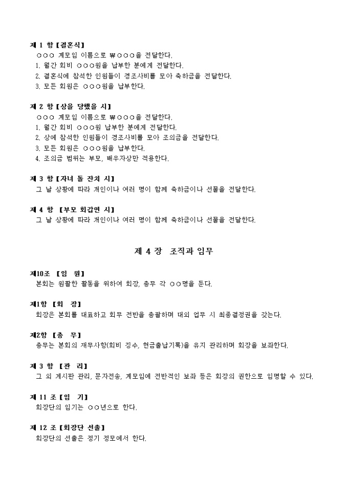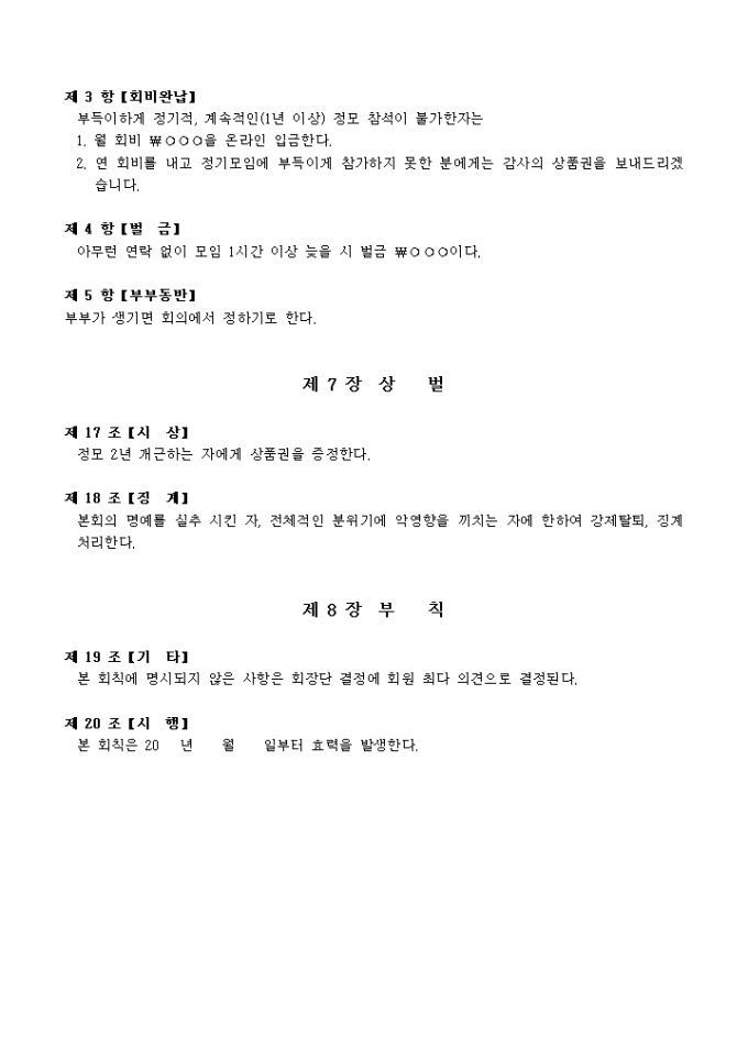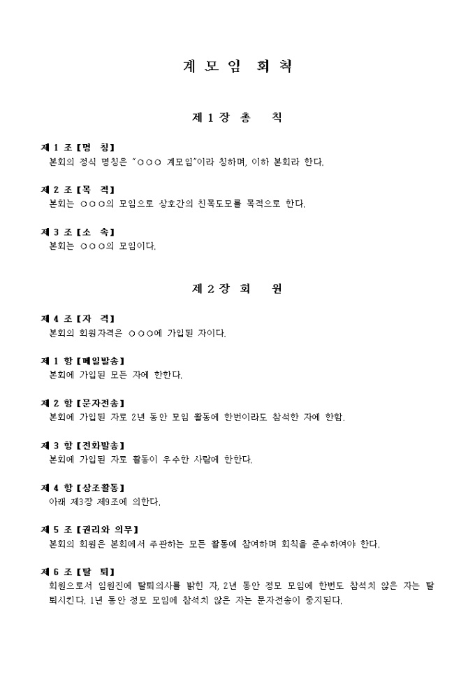9,000원/월총칙, 회원, 운영, 조직과 임무 등 20개 조항으로 구성되어있는 계모임 회칙입니다.