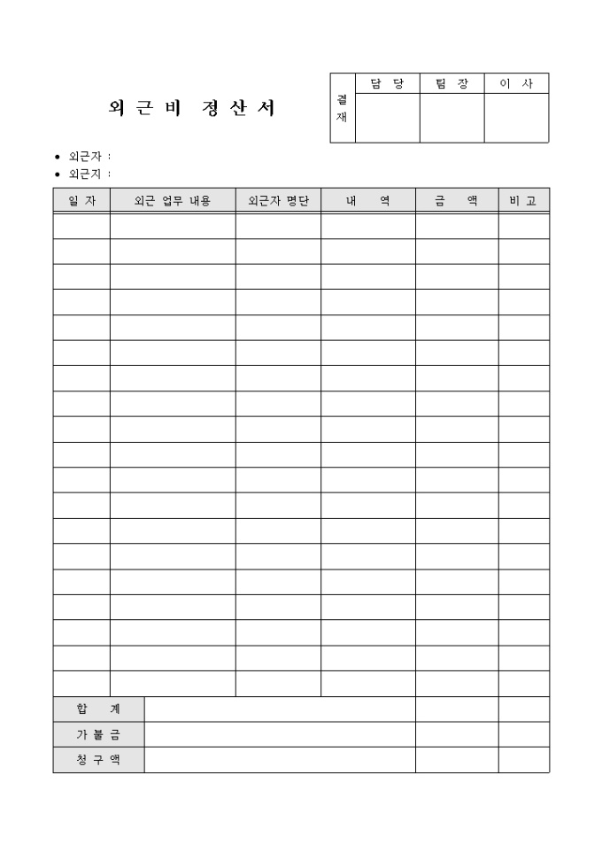 9,000원/월일자, 외근 업무 내용, 외근자 명단, 내역, 금액 등의 항목으로 구성되어있는 외근비 정산서 양식입니다.