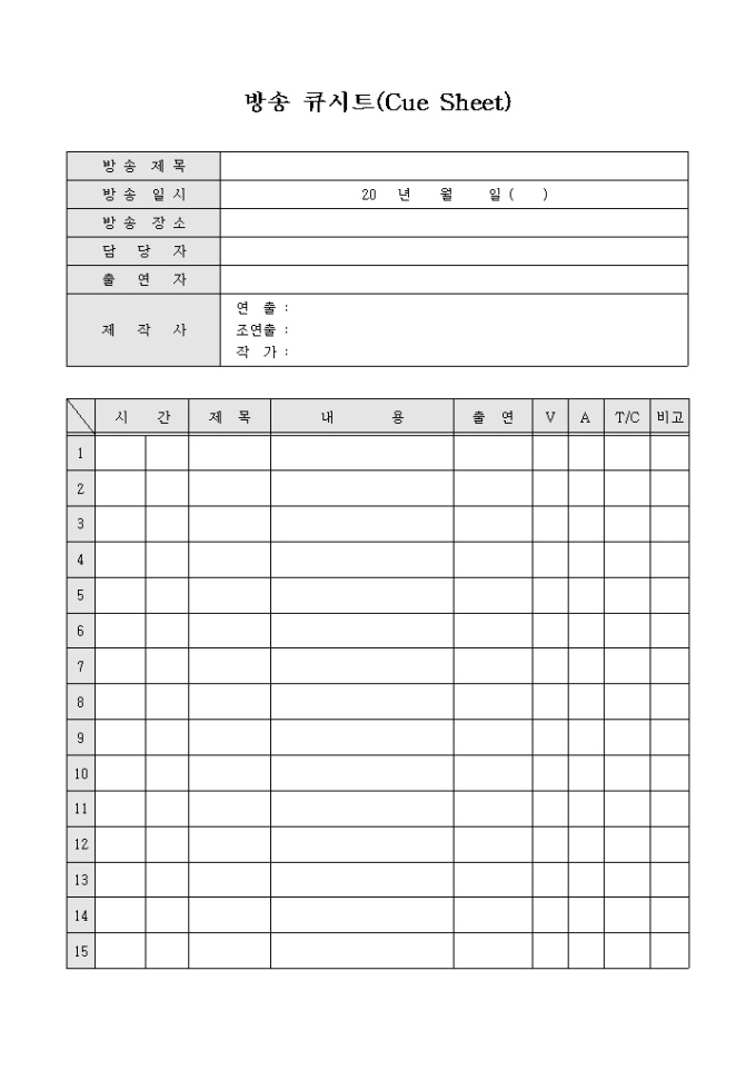 방송제목, 방송일시, 담당자, 시간, 제목, 내용, 출연 등의 항목으로 구성되어있는 방송 큐시트(Cue Sheet) 양식입니다.