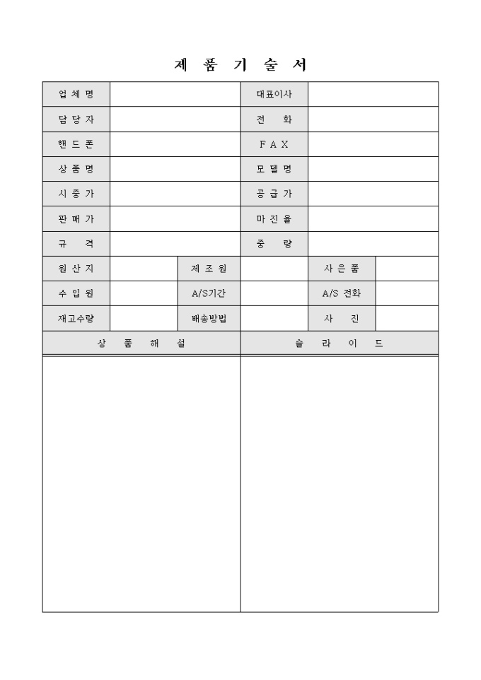 업체명, 담당자, 핸드폰, 상품명, 시중가 등의 항목으로 구성되어있는 제품기술서 양식입니다.