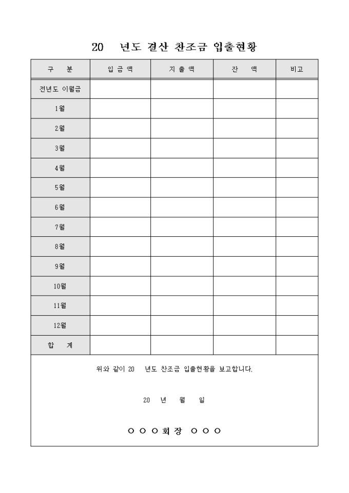 9,000원/월구분, 입금액, 지출액, 잔액 등의 항목으로 구성되어있는 찬조금 입출현황표 양식입니다.
