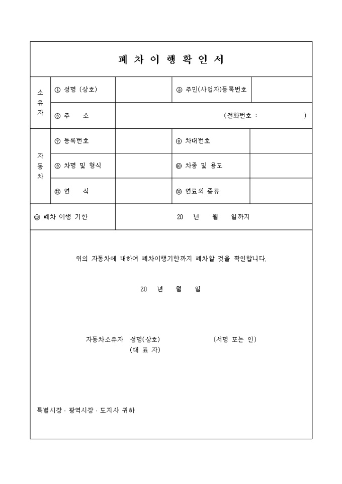 9,000원/월소유자, 자동차, 폐차이행기한 등의 항목으로 구성되어있는 폐차이행확인서 양식입니다.