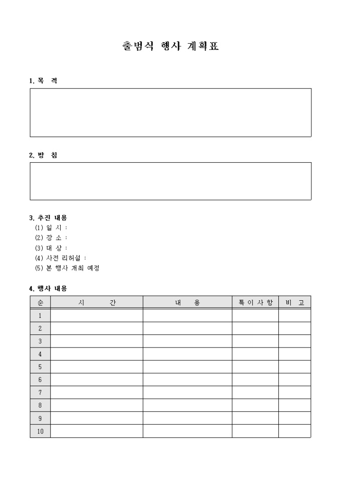 9,000원/월목적, 방침, 추진내용, 행사내용 등의 항목으로 구성되어있는 출범식 행사 계획표입니다.