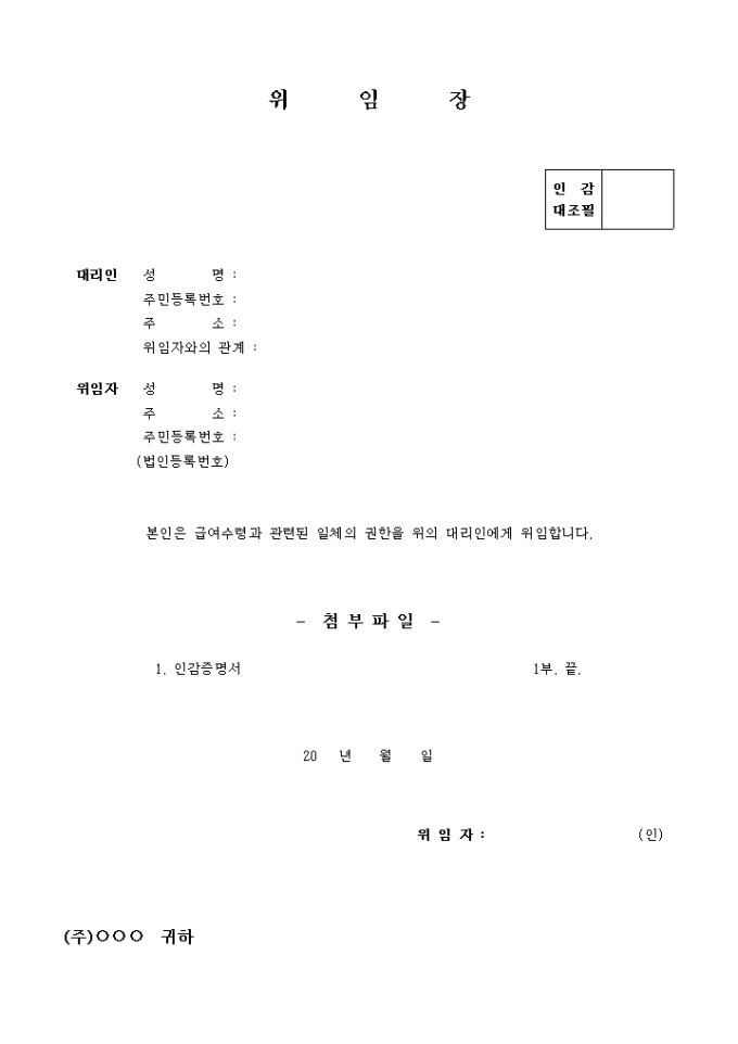 9,000원/월본인은 급여수령과 관련된 일체의 권한을 위의 대리인에게 위임합니다 라는 내용의 급여 대리수령 위임장입니다