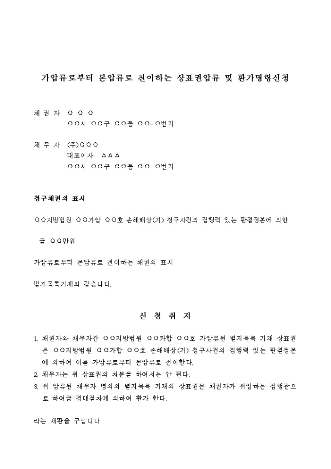9,000원/월가압류로부터 본압류로 전이하는 상표권압류 및 환가명령신청서입니다.