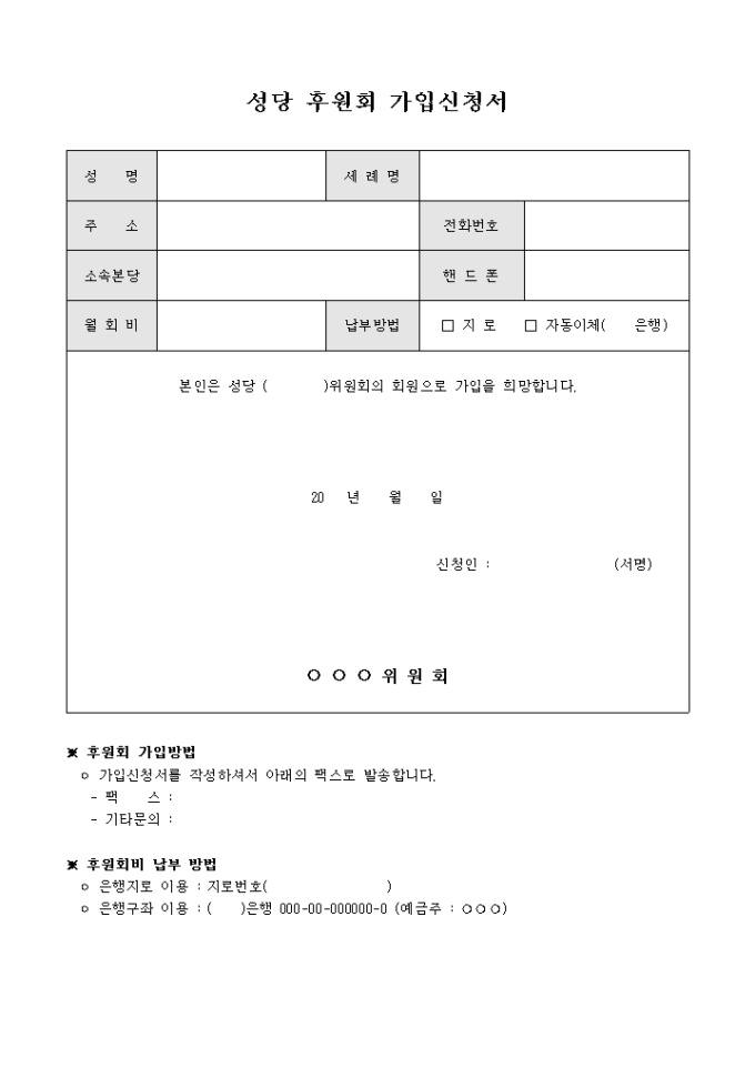 9,000원/월성명, 주소, 세례명, 전화번호, 핸드폰, 월회비, 납부방법 등의 항목으로 구성되어있는 성당 후원회 가입신청서 양식입니다.