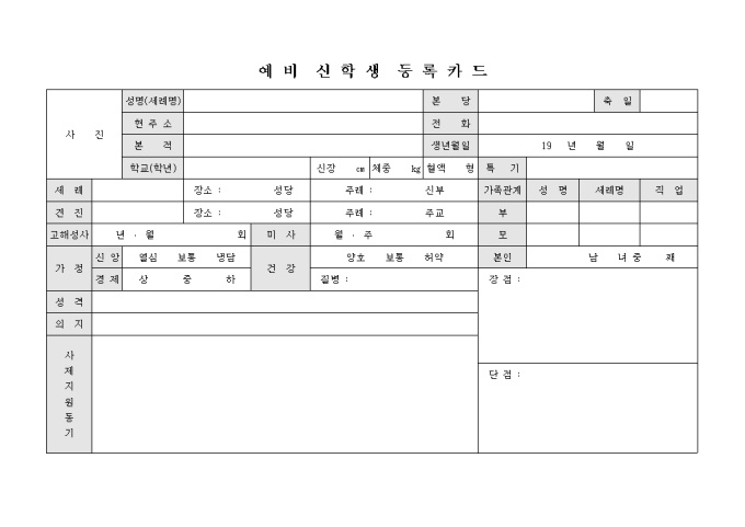9,000원/월성명, 현주소, 본적, 학교, 세례, 견진, 고해성사 등의 항목으로 구성되어있는 예비신학생 등록카드입니다.