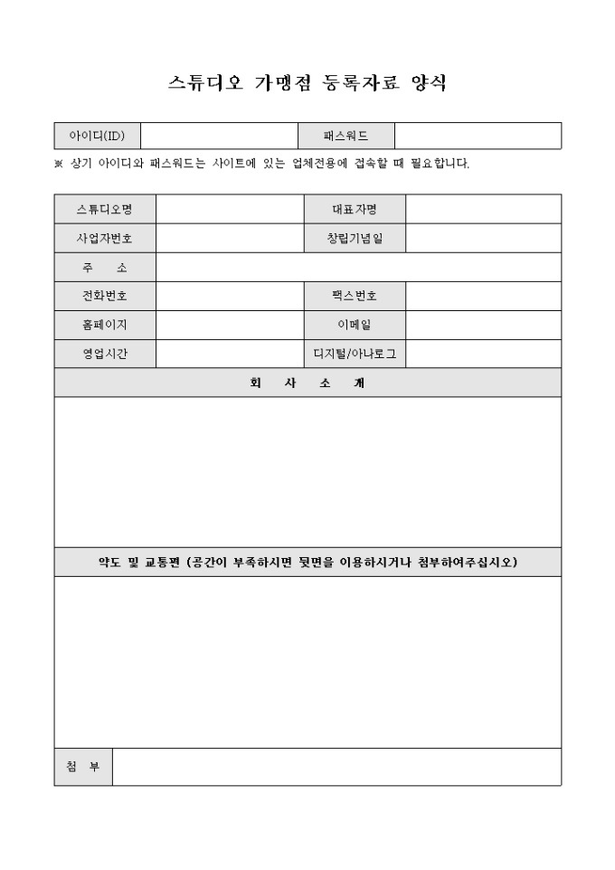 아이디, 패스워드, 스튜디오명, 사업자번호, 주소 등의 항목으로 구성되어있는 스튜디오 가맹점 등록자료입니다.