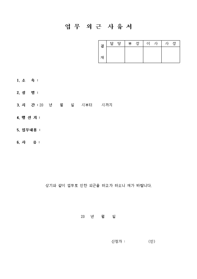 소속, 성명, 시간, 행선지, 업무내용, 사유 등의 항목으로 구성되어있는 업무 외근 사유서입니다.