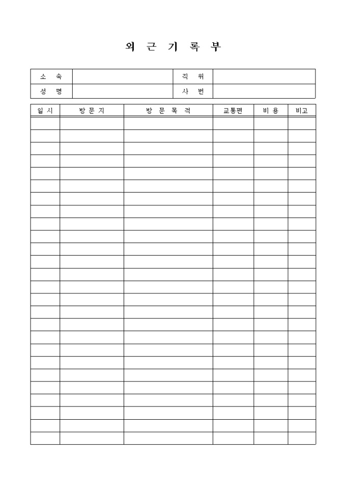 9,000원/월소속, 성명, 직위, 사번, 일시, 방문지 등의 항목으로 구성되어있는 외근기록부 양식입니다.