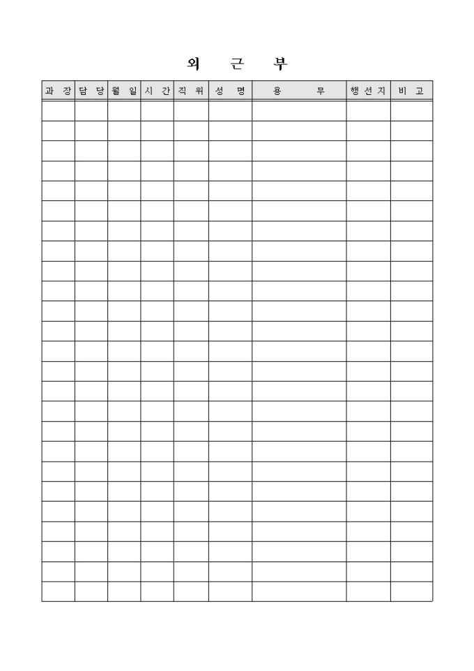 9,000원/월월일, 시간, 직위, 성명, 용무 등의 항목으로 구성되어있는 외근부 양식입니다.