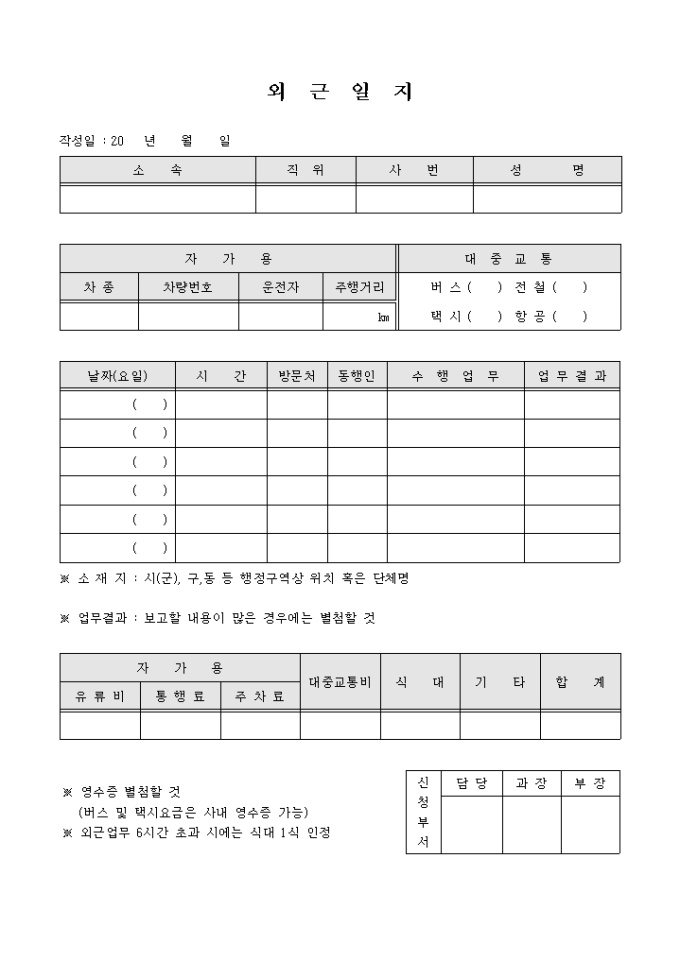 9,000원/월소속, 직위, 사번, 성명, 자가용, 대중교통, 시간, 방문처 등의 항목으로 구성되어있는 외근일지 양식입니다.
