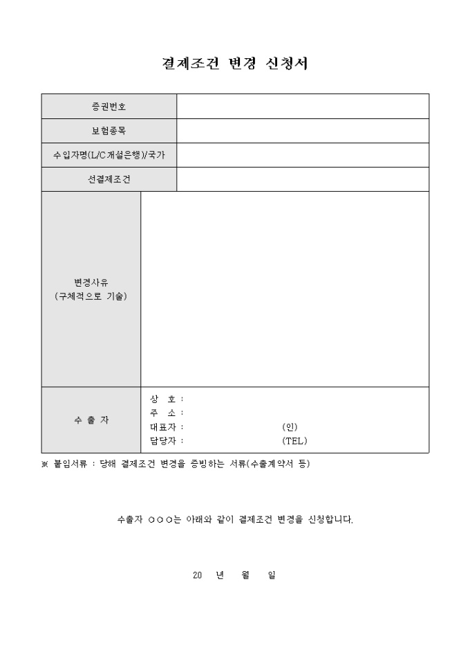 9,000원/월증권번호, 보험종목, 수입자명, 선결제조건 등의 항목으로 구성되어있는 결제조건 변경 신청서 양식입니다.