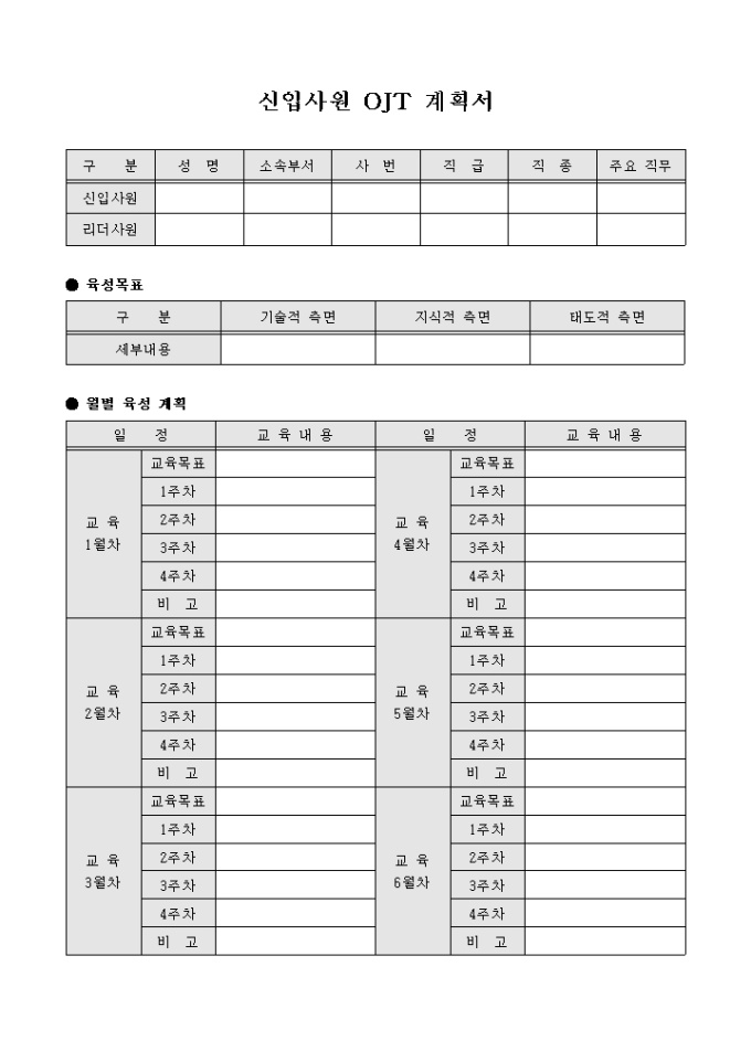 9,000원/월신입사원 인적사항, 육성목표, 월별 육성 계획 등의 항목으로 구성되어있는 신입사원 OJT 계획서 양식입니다.