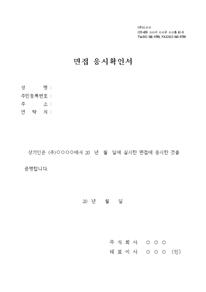 성명, 주민등록번호, 주소, 연락처 등의 항목으로 구성된 면접 응시확인서입니다.