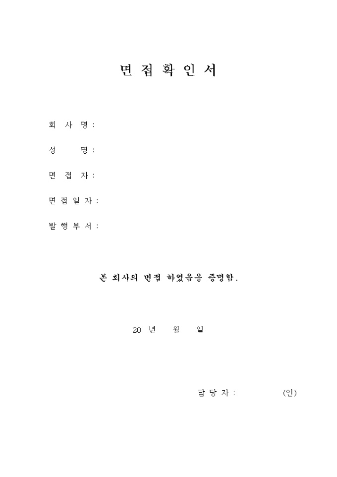 9,000원/월회사명, 성명, 면접자, 면접일자, 발행부서 등의 항목으로 구성된 기본면접확인서입니다.