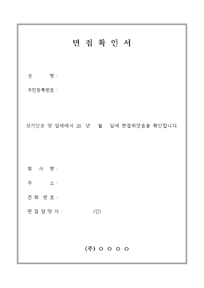 9,000원/월회사명, 주소, 전화번호, 면접담당자 등의 항목으로 구성된 업체면접확인서입니다.