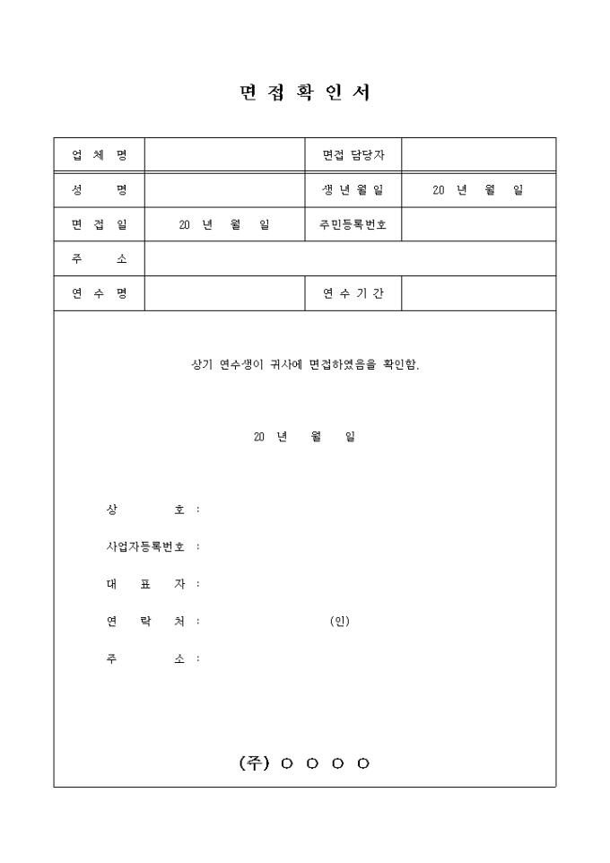 9,000원/월업체명, 면접담당자, 성명, 면접일, 연수명, 연수기간 등의 항목으로 구성된 연수생 면접확인서 양식입니다.