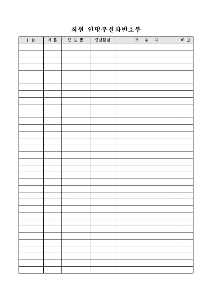 ID, 이름, 핸드폰, 생년월일, 거주지 등의 항목으로 구성된 회원 인명부전화번호부 양식입니다.