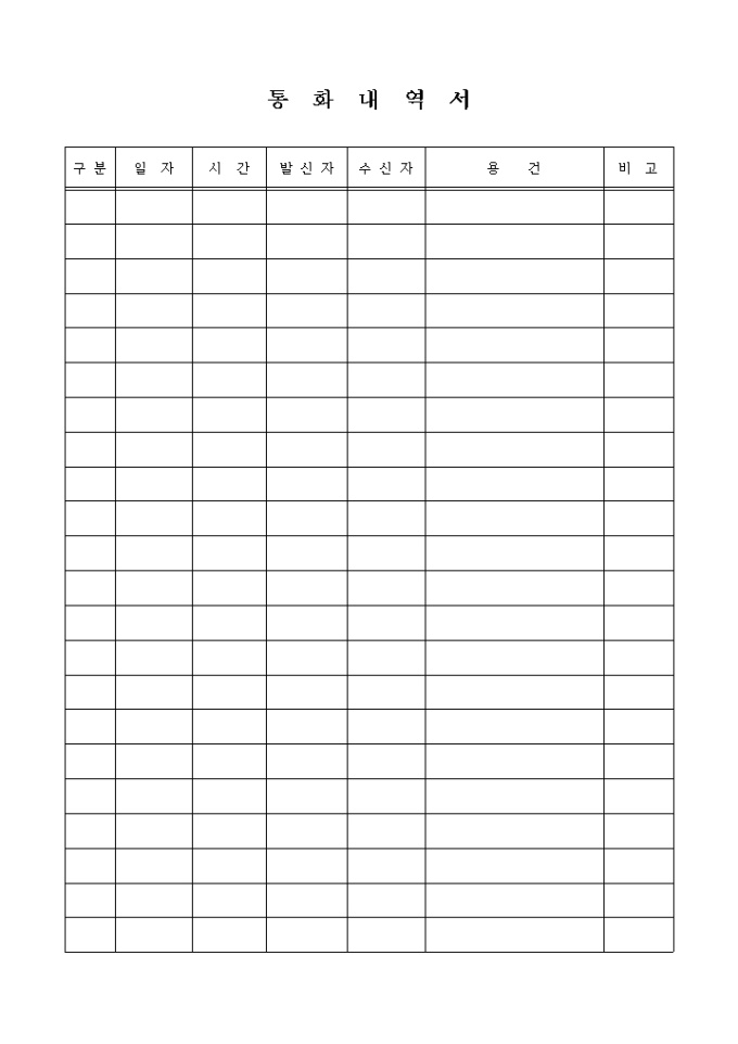 9,000원/월구분, 일자, 시간, 발신자, 수신자, 용건 등의 항목으로 구성된 통화내역서입니다.