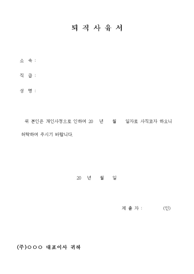 9,000원/월위 본인은 개인사정으로 인하여 사직코자 하오니 허락하여 주시기 바란다는 내용의 퇴직사유서입니다.