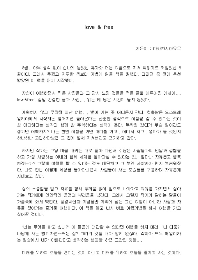 9,000원/월[본문 미리보기] 8월.. 아무 생각 없이 신나게 놀았던 휴가와 더운 여름으로 지쳐 책읽기도 귀찮았던 8월이다. 그래서 두껍고 지루한 책보다 가볍게 읽을 책을 원했다. 그러던 중 전에 추천 받았던 이 책을 읽기 시작했다. 자신이 여행하면서 찍은 사진들과 그 당시 느낀 것들을 적은 글로 이루어진 에세이.... love&free. 정말 간결한 글과 사진.... 읽는 데 많은 시간이 들지 않았다. 계획하지 않고 무작정 떠난 여행.... 발이 가는 곳 어디든지 간다. 첫출발은 오스트레일리아에서 시작해돈 떨어지면 돌아온다는 단순한 생각으로 여행을 갈 수 있다는 것이 참 대단하다는 생각과 함께 참 무식하다는 생각이 든다. 무작정 갔다가 무슨 일이라도 생기면 어떡하지? 나는 한번 여행을 가면 어디를 가고.. 어디서 자고.. 얼마가 들 것인지 하나하나 고민하다보면 그 전에 벌써 지쳐버리고 포기하고 만다.