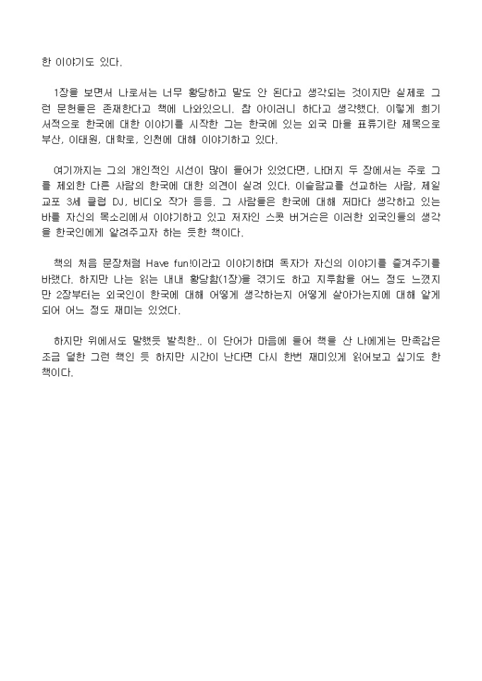 [본문 미리보기] 1만 명 인맥 만들기란 동호회에서 추천해주는 도서목록을 보다 제목이 마음에 들어 책 내용을 보고 주문하게 된 책..... 4월 말에 사서 얼마 전에야 다 읽었지만 참....제목만 보고 평가만 보고 책을 사는 게 아니구나 이런 생각을 하게된 책입니다. 나름 읽고 나서 이런 외국인도 있구나 하는 생각을 하게되었지만 제목처럼 발칙한.... 이 단어가 나올 정도로 발칙하지도 않고 너무 많은 내용을 이야기하고 싶어하는 듯 하다. 마치 즐겨보는 컴퓨터 잡지처럼 한국인을 대상으로 쓴 하나의 잡지를 읽은 듯한 느낌이었다. 처음 대부분의 책이 책을 발간하게된 동기나 고마운 사람들의 이야기를 적지만 이 책은 서두에 아주 흥미로운 이야기로 시작한다. 방송취재를 하는 동안의 이야기를 늘려놓는데 대한민국의 고정관념이랄까.... 대표적으로 한국에 사는 대부분의 외국사람들이 김치를 모두 좋아하는 것? 방송촬영 중 담배 피우는 건 안 된다? 외국사람들이 모두 한사람처럼 여겨지는 듯한 사고방식을 보여주는 TV와 다르게 지은이는 한국음식을 너무 잘먹어 방송촬영도 중지 당한다.