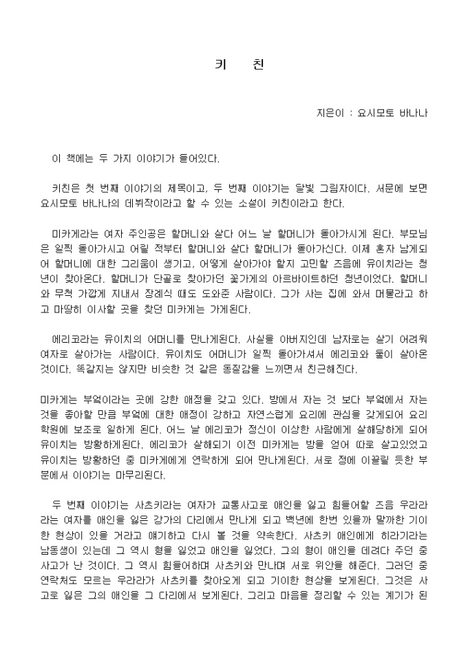 9,000원/월[본문 미리보기] 이 책에는 두 가지 이야기가 들어있다. 키친은 첫 번째 이야기의 제목이고, 두 번째 이야기는 달빛 그림자이다. 서문에 보면 요시모토 바나나의 데뷔작이라고 할 수 있는 소설이 키친이라고 한다. 미카게라는 여자 주인공은 할머니와 살다 어느 날 할머니가 돌아가시게 된다. 부모님은 일찍 돌아가시고 어릴 적부터 할머니와 살다 할머니가 돌아가신다. 이제 혼자 남게되어 할머니에 대한 그리움이 생기고, 어떻게 살아가야 할지 고민할 즈음에 유이치라는 청년이 찾아온다. 할머니가 단골로 찾아가던 꽃가게의 아르바이트하던 청년이었다. 할머니와 무척 가깝게 지내서 장례식 때도 도와준 사람이다. 그가 사는 집에 와서 머물라고 하고 마땅히 이사할 곳을 찾던 미카게는 가게된다.