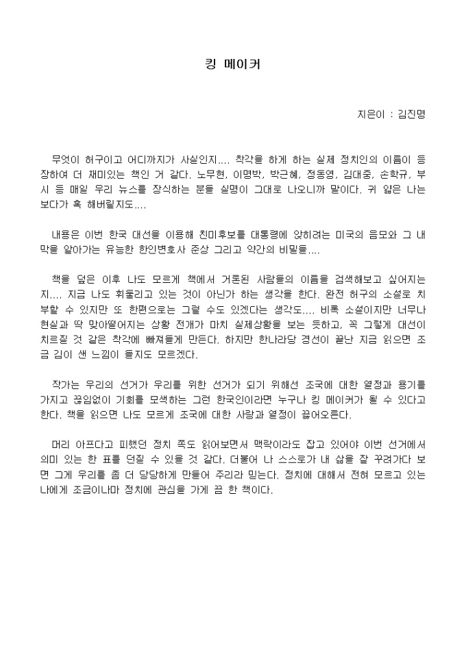 [본문 미리보기] 무엇이 허구이고 어디까지가 사실인지.... 착각을 하게 하는 실제 정치인의 이름이 등장하여 더 재미있는 책인 거 같다. 노무현, 이명박, 박근혜, 정동영, 김대중, 손학규, 부시 등 매일 우리 뉴스를 장식하는 분들 실명이 그대로 나오니까 말이다. 귀 얇은 나는 보다가 혹 해버릴지도.... 내용은 이번 한국 대선을 이용해 친미후보를 대통령에 앉히려는 미국의 음모와 그 내막을 알아가는 유능한 한인변호사 준상 그리고 약간의 비밀들.... 책을 덮은 이후 나도 모르게 책에서 거론된 사람들의 이름을 검색해보고 싶어지는 지.... 지금 나도 휘둘리고 있는 것이 아닌가 하는 생각을 한다. 완전 허구의 소설로 치부할 수 있지만 또 한편으로는 그럴 수도 있겠다는 생각도.... 비록 소설이지만 너무나 현실과 딱 맞아떨어지는 상황 전개가 마치 실제상황을 보는 듯하고, 꼭 그렇게 대선이 치르질 것 같은 착각에 빠져들게 만든다. 하지만 한나라당 경선이 끝난 지금 읽으면 조금 김이 샌 느낌이 들지도 모르겠다.