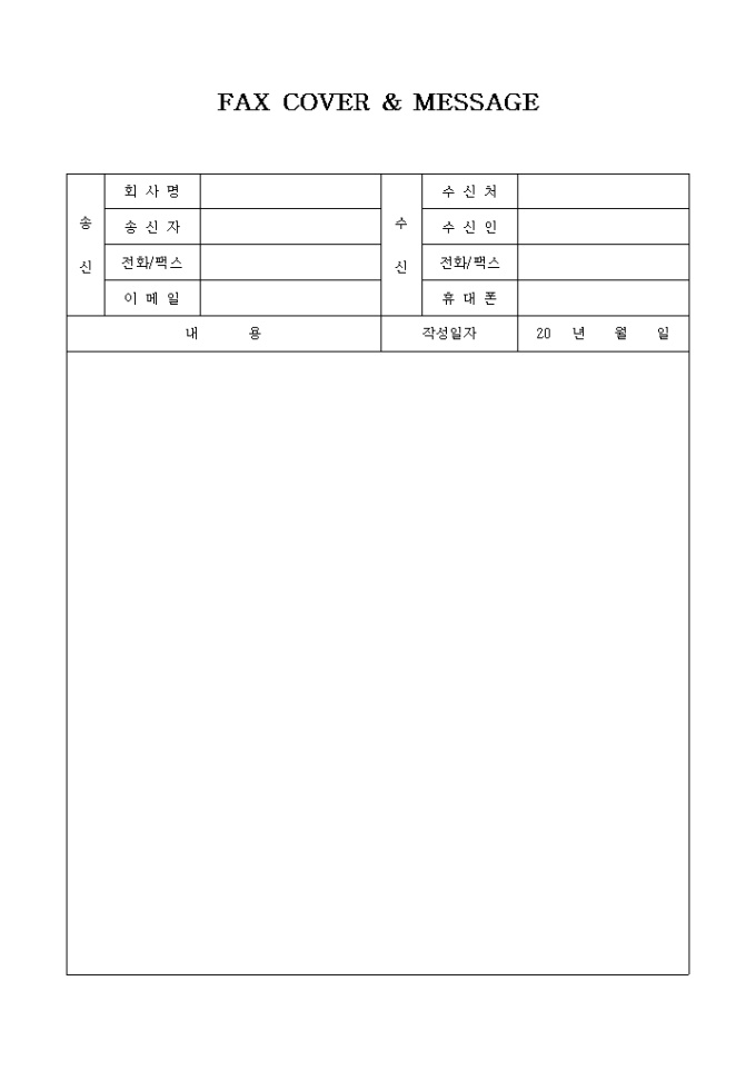 회사명, 송신자, 이메일, ,수신처 내용 작성일자 등의 항목으로 구성된 팩스커버 양식입니다.