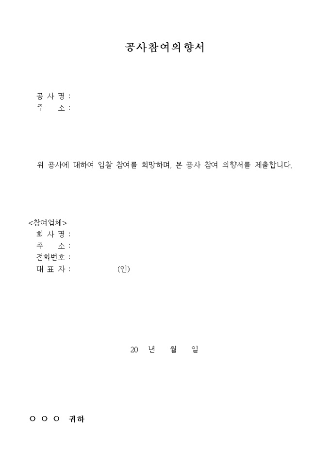9,000원/월공사명, 주소, 참여업체 회사명, 주소 등의 항목으로 구성되어 공사에 대하여 입찰참여를 희망한다는 내용의 공사참여의향서입니다.