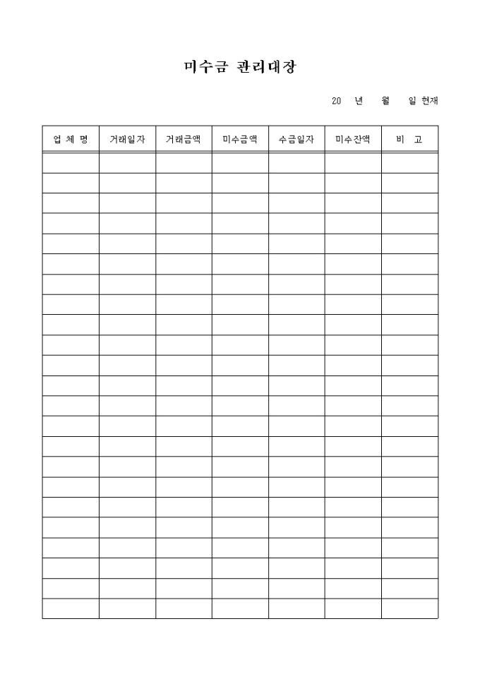 9,000원/월업체명, 거래일자, 거래금액, 미수금액, 수금일자, 미수잔액 등의 항목으로 구성된 미수금 관리대장입니다.