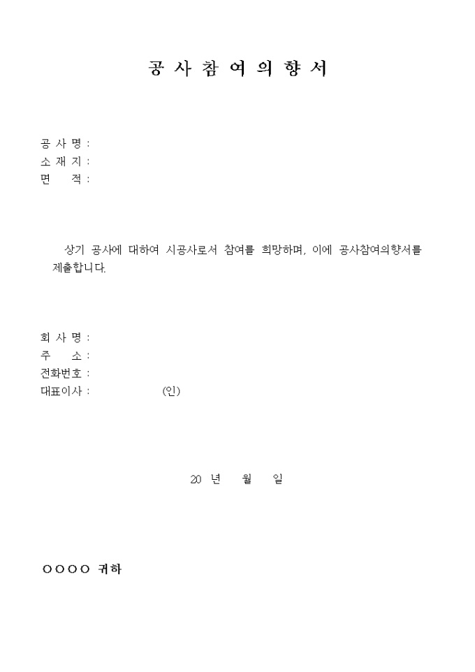 공사명, 소재지, 면적, 참여회사명, 주소 등의 항목으로 구성된 공사에 대하여 시공사로서 참여를 희망한다는 내용의 공사참여의향서입니다.