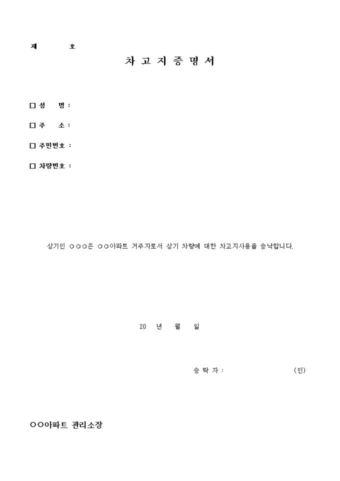 9,000원/월성명, 주소, 주민번호, 차량번호 등의 항목으로 구성되어 아파트 거주자로서 차량에 대한 차고지 사용을 승낙한다는 내용의 차고지 증명서입니다.
