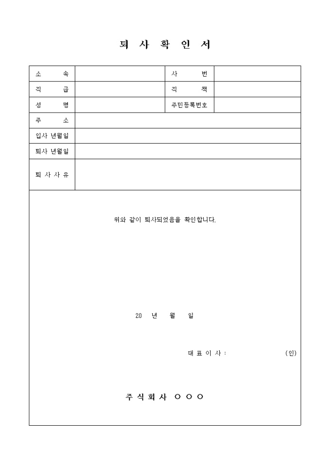 소속, 사번, 직급, 직책, 성명, 주소, 퇴사년월일, 퇴사사유 등의 항목으로 구성되어 퇴사되었음을 확인한다는 내용의 퇴사확인서입니다.