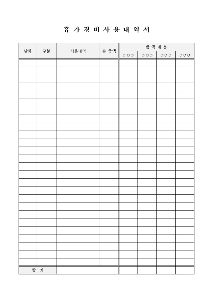 9,000원/월날짜, 구분, 사용내역, 총금액 등의 항목으로 구분해 휴가시 사용한 경비에 대해 내역서를 작성할수 있는 휴가 경비사용내역서 양식입니다.