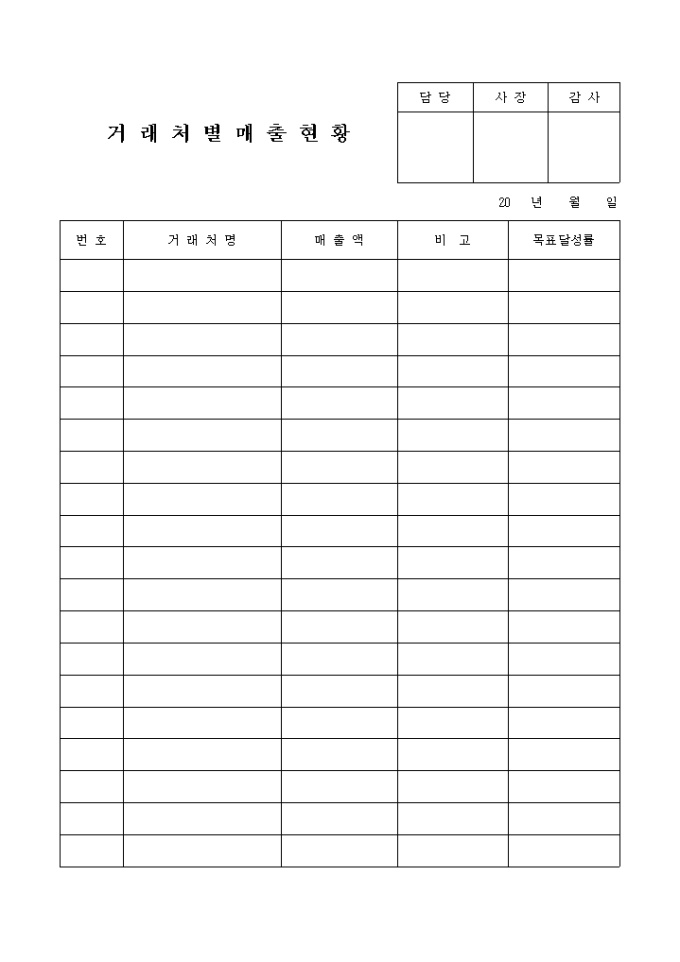 거래처며명, 매출액, 목표달성률 등의 항목으로 구성되어 거래처별로 매출현황을 알 수 있는 거래처별매출현황표입니다. 결재란을 포함하고 있습니다.