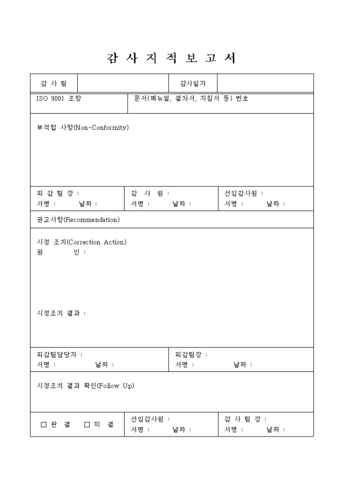 부적합 사항,시정조치 원인,권고사항을 기록하는 감사지적보고서입니다.