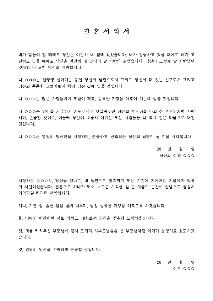 9,000원/월신랑신부가 결혼을 할며 서약식을 할때 사용할 수 있는 결혼서약서입니다. 신랑과 신부의 서약글이 함께 있습니다.