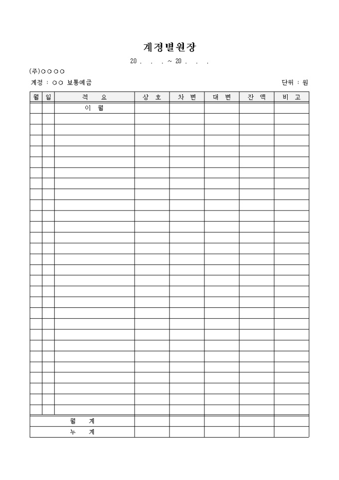 9,000원/월월일, 적요, 상호, 차변, 대변 , 잔액 등의 항목으로 구성되어 합계를 쉽게 알수있도록 작성이 가능한 계정별원장 양식입니다.