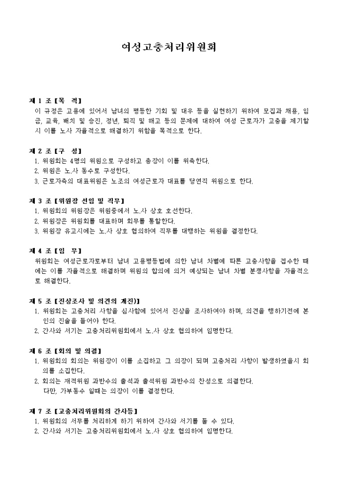 목적, 구성, 위원장선임 및 직무, 임무 등 부칙을 포함하여 9개조항으로 구성된 여성고충처리위원회입니다.