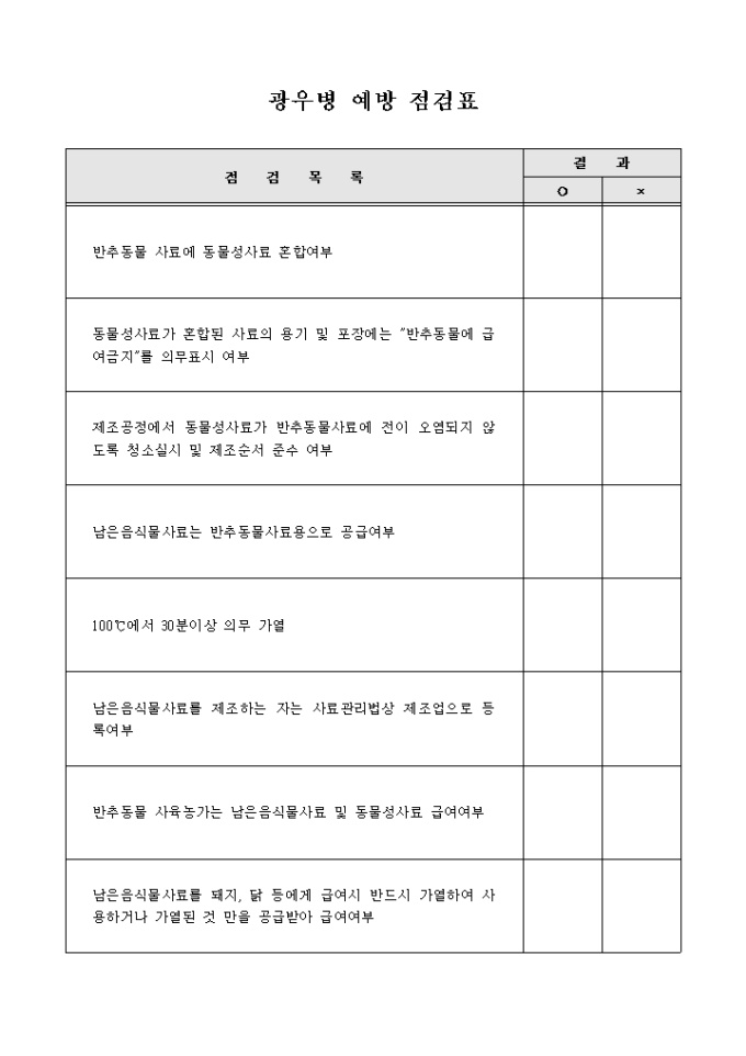 9,000원/월미국산 쇠고기 수입으로 인한 쇠고기의 광우병예방목록을 수록한 광우병 예방점검표 양식입니다.