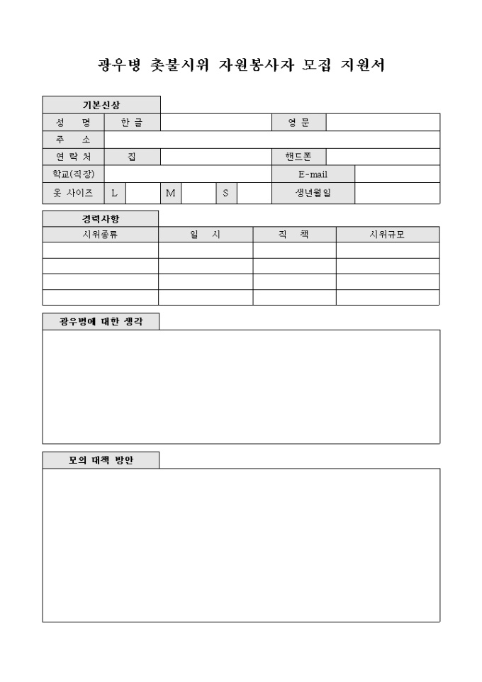 9,000원/월기본신상, 경력사항, 광우병에 대한 생각, 모의 대책방안 등의 항목으로 구성되어 미국산 쇠고기가 수입되는 것을 반대하는 촛불시위 자원봉사자 모집 지원서 양식입니다.