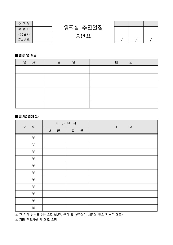 9,000원/월워크샵 일정 추진에 관한 사항을 기록하고 승인을 얻고자 할 때 사용할 수 있는 워크샵 추진일정 승인표입니다. 일정 및 요일, 참가인원 등의 항목으로 구성되어있습니다.